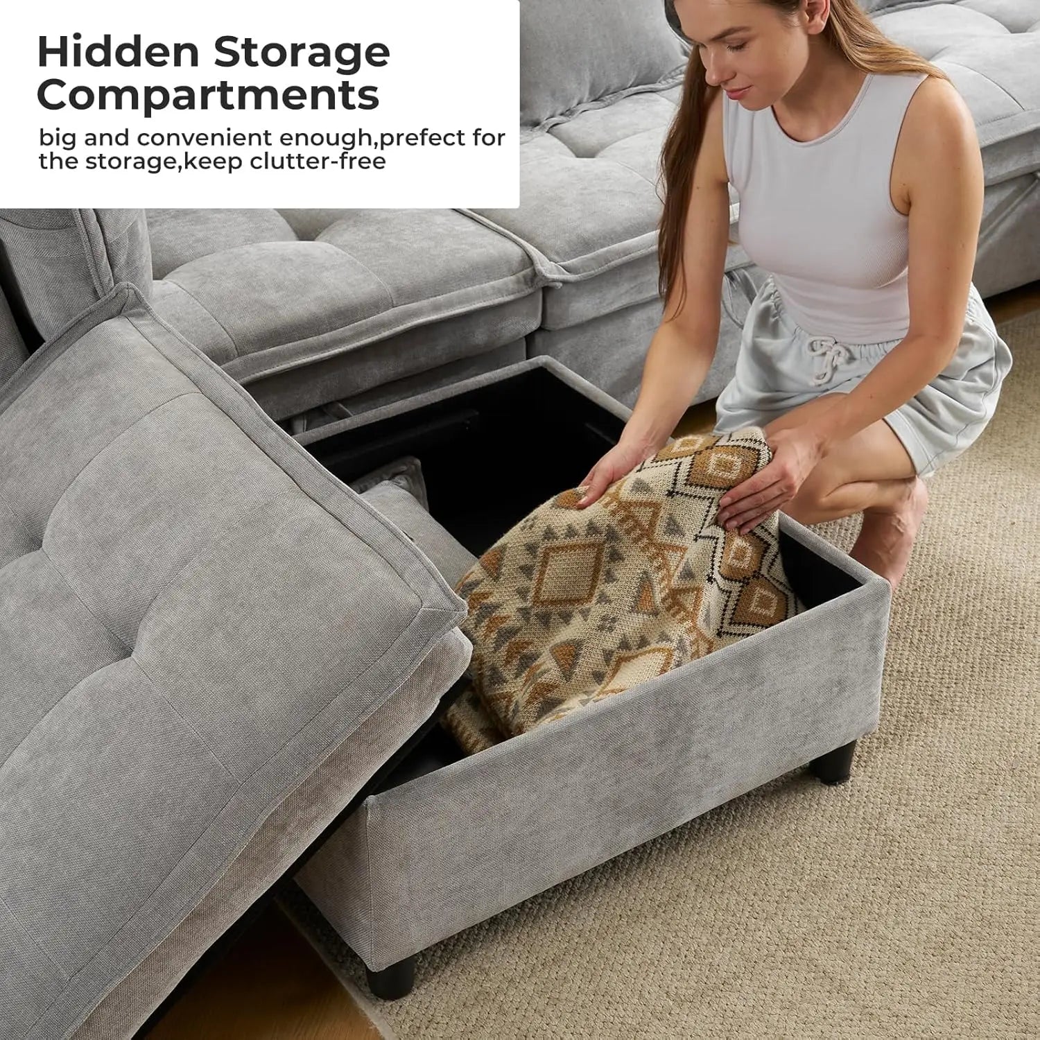 Hidden Storage Space: Our couch with storage Every seat includes a built-in storage compartment,Ideal for blankets, Toys, Remotes, and more. A smart way to reduce clutter and keep your living area neat, Organized, And efficient.