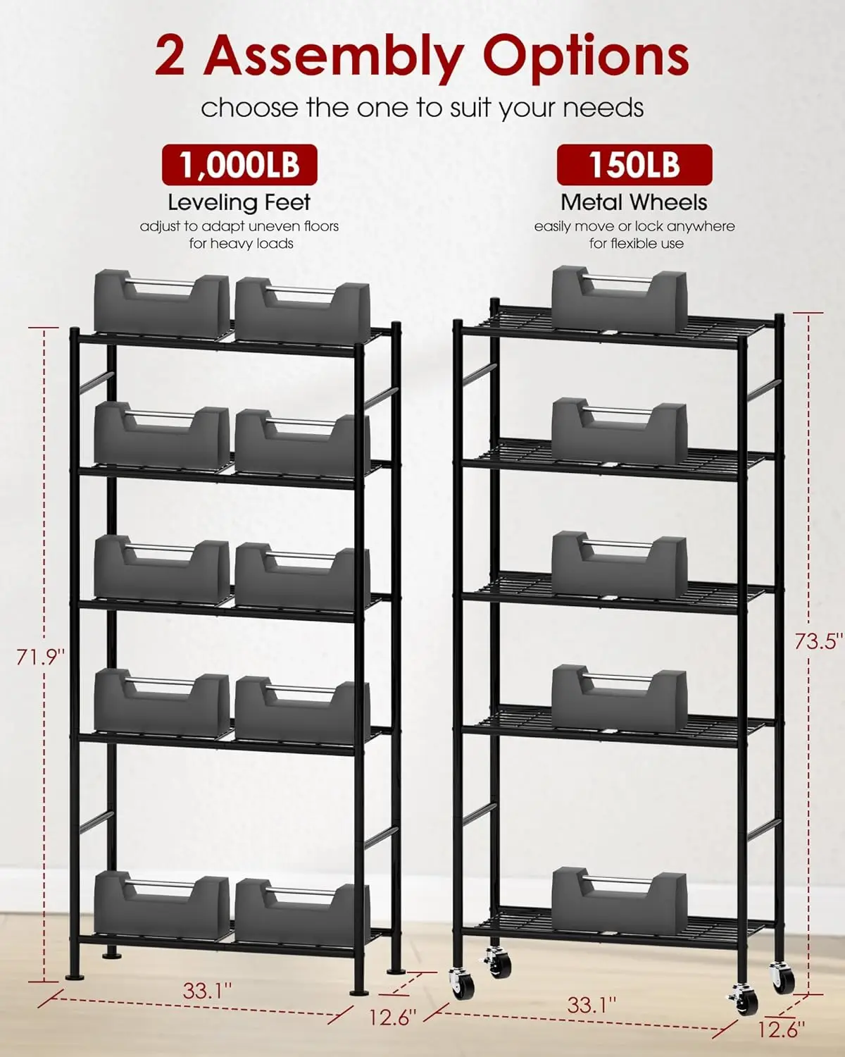 - Heavy-duty 5-tier design with reinforced metal tubes supports up to 1,000 lbs on leveling feet or 150 lbs per shelf on wheels—great for tools, appliances, pantry items, laundry supplies, and bins.